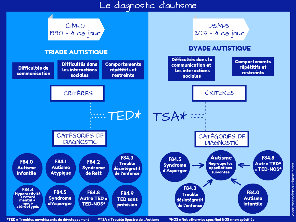 L’autisme, que l’on nomme désormais Trouble du Spectre Autistique, est un trouble envahissant du développement qui affecte considérablement le rapport aux autres et qui se caractérise par un comportement répétitif et stéréotypé. Depuis 1990, la 10e édition de la Classification Internationale des Maladies était la référence des praticiens de santé pour classer les différentes catégories d’autisme. Elle recense plusieurs catégories de Trouble Envahissant du Développement (TED).