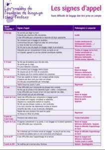 À partir de 3 ans et au-delà, il s’agira de difficultés de compréhension, d’expression, de construction des phrases, de prononciation ou encore un vocabulaire restreint. Ci-dessous le détail des signes d’appel dans un document de la FNO.