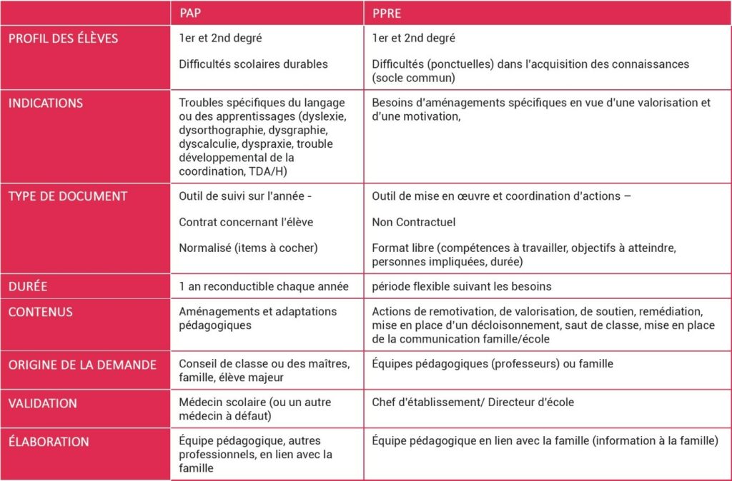 Le plan d’accompagnement personnalisé (PAP) : Il concerne les élèves présentant des difficultés scolaires sévères liées à des troubles de l’apprentissage. C’est un document qui répertorie les aménagements et adaptations pédagogiques appliqués à l’EIP. Ce suivi est tenu par les enseignants de l’élève de la maternelle au lycée, afin d’éviter la rupture dans les adaptations d’une année à l’autre.