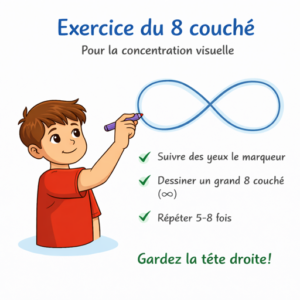 Cet exercice consiste à tracer dans l’air ou sur une feuille un 8 couché (∞) avec les yeux ou avec la main.