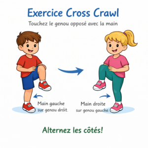 Cet exercice consiste à toucher le genou gauche avec la main droite puis le genou droit avec la main gauche, en alternance. Il vise à stimuler la coordination et la communication entre les deux hémisphères du cerveau.